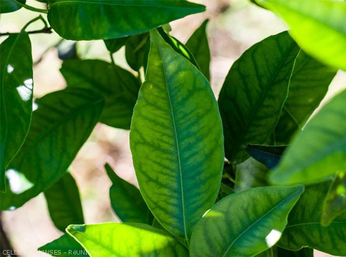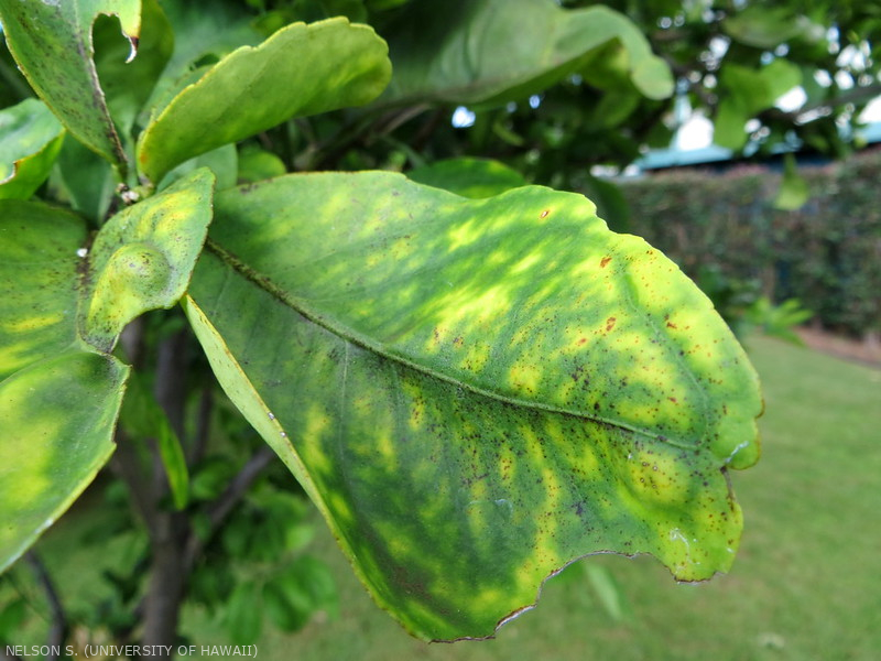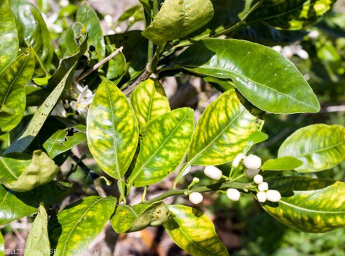 Feuilles : pâles avec nervures vertes, blanchiment Fruits : peu nombreux et petits