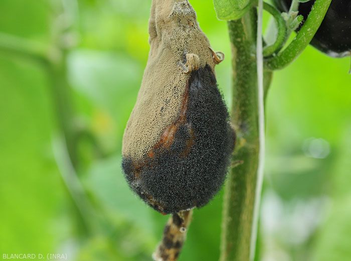 - Montre un comportement sur fruits d'aubergine assez comparable à celui de Botrytis cinerea ; on peut même les observer en même temps sur les même fruits.