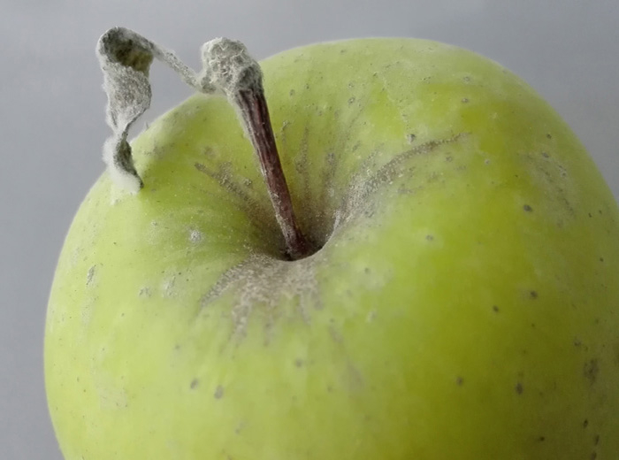 - Feutrage superficiel, de couleur généralement gris clair ou blanc, d’intensité variable, se développant à la surface des pommes, sur l’épiderme (figure 3), ou sur le pédoncule (figures 1 et 2).