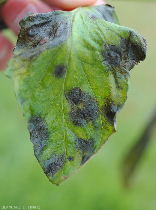 Sur les folioles, on peut observer des taches d'abord brunes et humides, surtout localisées en périphérie du limbe, et évoluant rapidement jusqu'à couvrir des secteurs parfois importants (figures 5 à 7). Des motifs bruns en arabesques plus ou moins concentriques sont bien visibles sur les tissus lésés. Ces taches, souvent chlorotiques en périphérie, finissent par se nécroser et se dessécher. Les tissus décomposés peuvent tomber. Les fleurs seraient aussi attaquées et détruites.