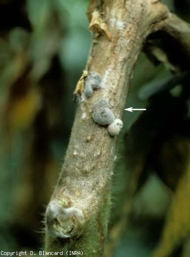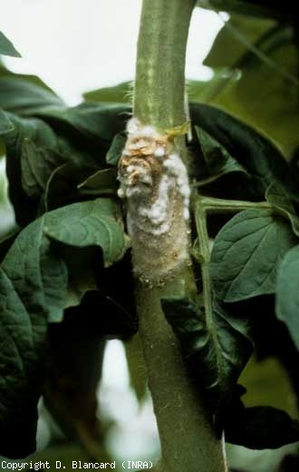 Sur les plantes plus âgées, ces deux champignons se comportent aussi en colonisateurs des blessures et des bases nutritives que représentent les tissus sénescents (pièces florales, folioles). Ils s'attaquent aussi très facilement aux portions d'organes entrant en contact avec le sol. Ainsi, des lésions humides et chancreuses peuvent être observées sur les tiges, au collet (figure de 1 à 3) ou en hauteur. Dans ce dernier cas, elles sont souvent localisées près des plaies d'ébourgeonnage et d'effeuillage sur les tomates tuteurées, notamment cultivées sous abris. Ces altérations évoluent progressivement et finissent par ceinturer la tige, qui prend une teinte beigeâtre à blanchâtre en se nécrosant (figures de 4 à 6). Celle-ci peut avoir été colonisée après l'installation du champignon sur un reste de pièce florale tombée directement sur elle ou sur une foliole à proximité.