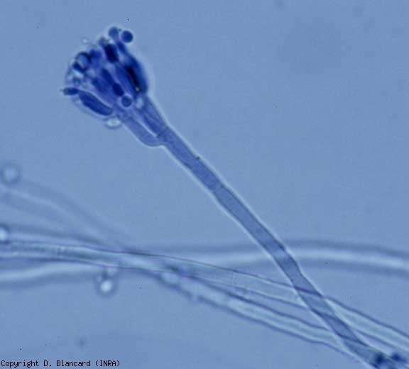 À titre d'exemple, nous ne décrirons que P. expansum, qui est l'espèce la plus souvent observée sur de nombreux fruits (pomme, poire, kiwi, orange, mandarine, pamplemousse, fraise) et sur divers légumes comme l'ail ou l'oignon. Comme de nombreux autres Penicillium, il est naturellement présent dans le sol et certainement sur les différents organes de la tomate. Il s'y conserve sous sa forme mycélienne ou à l'état de spores. Ces dernières, très légères et produites en masse, sont véhiculées par l'air jusqu'à ce qu'elles tombent à la surface d'un fruit à proximité d'une blessure. Elles germent alors, et le mycélium se développe de façon très extensive, poussant dans toutes les directions à l'intérieur de la chair qui se décompose progressivement grâce à plusieurs enzymes. Le champignon ne tarde pas à sporuler ; des conidiophores se développent générant des conidies (figures 5 et 6). Le nombre de spores présentes à la surface d'un fruit contaminé peut se chiffrer en millions. Dès qu'elles atteignent leur maturité, elles se séparent facilement et flottent dans l'air quelque temps avant de retomber et d'occasionner de nouvelles contaminations. La germination est optimale dans une atmosphère humide entre 20 et 25°C, et la croissance du mycélium s'arrête au-delà de 30°C. Signalons que P. expansum ne s'attaque qu'à des fruits tournants ou mûrs et qu'il synthétise deux toxines : la patuline, une mycotoxine assez fréquente en alimentation animale, et la citrinine.