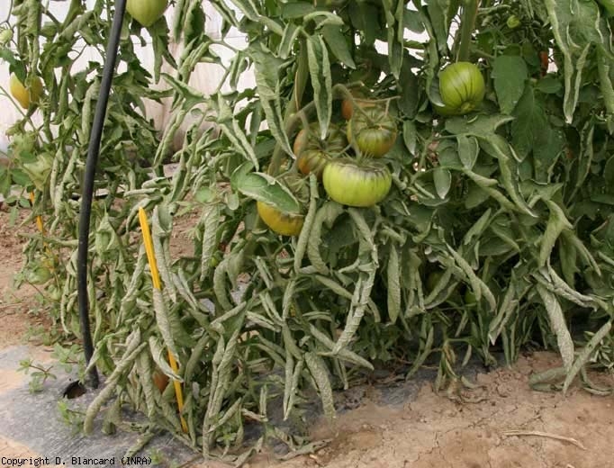 Le symptôme d'enroulement foliaire (leaf roll) peut se manifester sur des jeunes plants produits sous abri et mis en place en plein champ au cours de périodes humides. On l'observe généralement plus tard, sur des plantes ayant au moins 3 bouquets et en période estivale. Ce sont d'abord et surtout les feuilles basses de plantes cultivées en plein champ, et à un moindre degré sous abris, qui sont affectées. Le limbe des folioles s'incurve progressivement vers le haut et parfois inexorablement (figures 1 et 2) ; à terme, les bords opposés du limbe se rencontrent et les folioles finissent par être entièrement enroulées sur elles-mêmes (figures 3 et 4). Au final, les tissus sont souvent plus épais, craquants et luisants. Dans certaines situations particulièrement sévères, une forte proportion des feuilles est affectée, conférant aux plantes un aspect particulier.