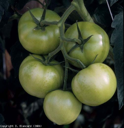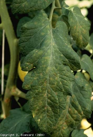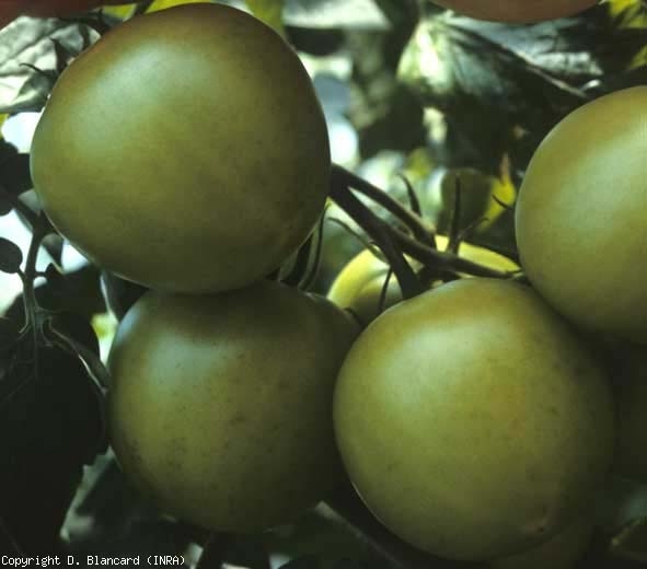 des flétrissements, de dessèchements, et des nécroses foliaires. Ainsi, les folioles des pieds de tomate affectés peuvent présenter :- des plages internervaires livides sur les feuilles basses, s'étendant, se nécrosant et se desséchant progressivement ;- une nécrose et un dessèchement de la périphérie du limbe des jeunes et des vieilles feuilles ;- un flétrissement et un dessèchement des feuilles de l'apex.