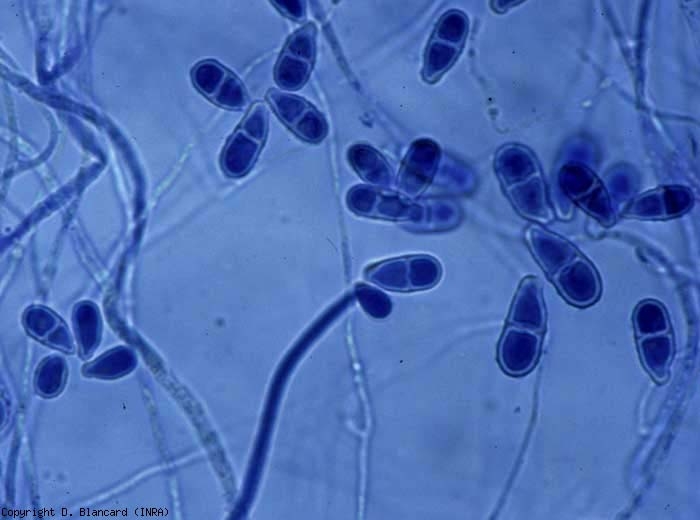 Ce champignon est à l'origine de lésions sombres, marbrées de veines brunes, qui apparaissent près de la cicatrice pédonculaire des fruits (figures 1). Celle-ci, en plus d'être auréolée d'une zone brune, se couvre d'une moisissure rose pâle. Cette moisissure est constituée des longs conidiophores arbusculeux du champignon portant des conidies bicellulaires, lisses et hyalines, allongées ou pyriformes (figures 2 et 3). D'une manière générale, les fruits affectés peuvent tomber prématurément. Trichothecium roseum peut synthétiser une mycotoxine dans les tissus altérés : le trichothécène.