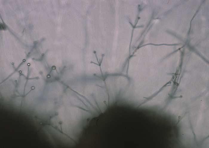 Elle est possible par le terreau, par le matériel agricole souillé par de la terre contaminée et par les débris végétaux. Les poussières de sol recelant des microsclérotes et/ou des conidies sont aisément disséminées par les courants d'air, ainsi que par les éclaboussures d'eau et des insectes telluriques.