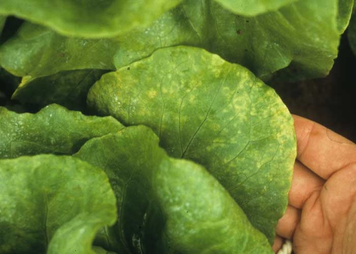 Sur les laitues beurre, des plages jaunes, punctiformes ou anguleuses, apparaissent dans un premier temps, conférant parfois à la face supérieure de la feuille un aspect persillé (figures 7 à 11). Des anneaux, des taches orangées peuvent également se développer.