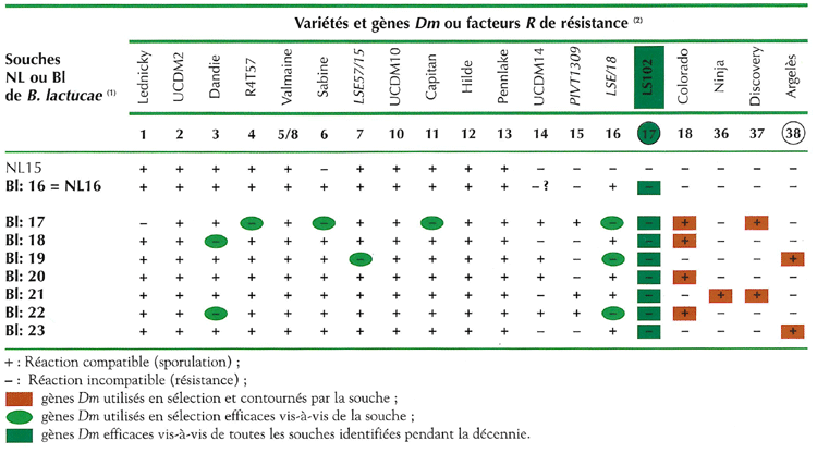A la fin des années 90, des attaques de mildiou ont été signalées dans plusieurs régions d'Europe sur certaines variétés déclarées résistantes aux races NL1 à 16. En France, un groupe de travail réunissant les sélectionneurs, le Geves et l'INRA, en relation avec un groupe néerlandais, a échangé des informations sur ces souches (souches les plus menaçantes pour les cultures européennes et celles permettant une distinction entre variétés). La connaissance des spectres de résistance de plusieurs nouvelles variétés vis-à-vis de ces souches a révélé les différentes résistances utilisées par les sélectionneurs : R18 dans de nombreuses variétés, mais aussi R36 de Ninja ou R38 d'Argelès. Les 6 souches retenues sont dénommées Bl 17 à Bl 22 (figure 1).