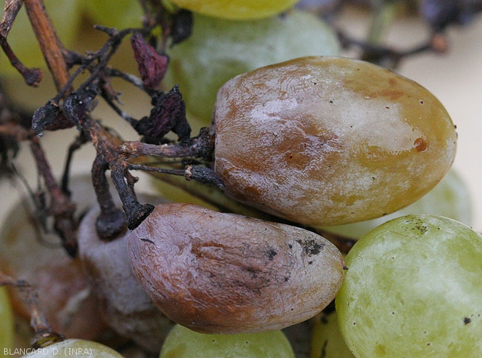 Les baies de raisin sont également affectées ; elles brunissent et se ratatinent progressivement (Figure 12).