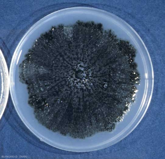 Sur milieu de culture, le champignon forme une colonie mycélienne de couleur noir-verdâtre qui se développe lentement (figures 12 et 13). Les pycnides se forment à la surface de la boite de Petri après 10 à 15 jours, si la colonie est éclairée et bien attachée au substrat. Enfin, ces pycnides sporulent abondamment une semaine plus tard à 20-25°C. On peut parfois aussi obtenir des périthèces in vitro.
