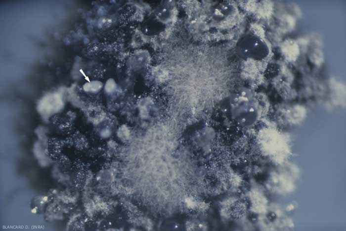 - La forme imparfaite produit des pycnides sphériques (59-196 µm de diamètre), solitaires, protubérantes, noires, ouvertes par un ostiole (figures 5 à 9) d'où vont s'échapper à maturité des pycniospores (figures 10 et 11). Ces pycniospores sont incolores, ovoïdes (4,5-9,3 x 4,5-5 µm) enrobées dans un cordon mucilagineux (cirrhe) de couleur blanchâtre (figure 7).