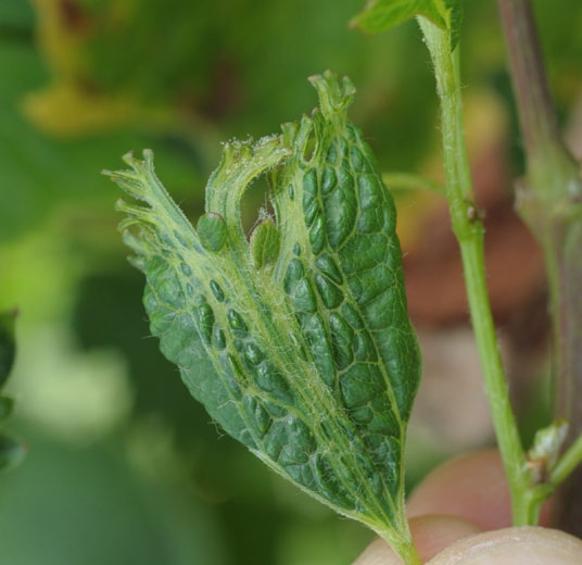 Lors de l'application de pesticides sur vigne, il arrive parfois que les pressions mises en oeuvre pour pulvériser ces derniers soient momentanément trop importantes. Les jeunes et tendres folioles ayant subi de telles pressions peuvent se retrouver plus ou moins criblées, voire déchiquetées.