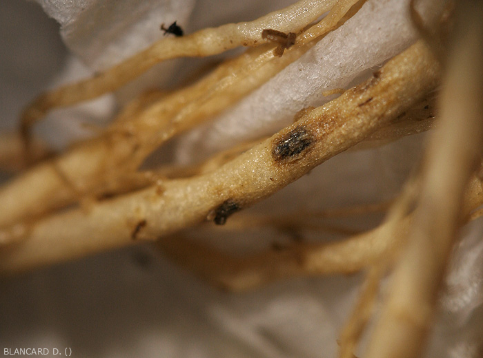 - Lésions sur racines d'extension limitée, humides, brunes à noires, parfois superficiellement subérisées. Elles sont présentes en faible nombre sur les racines principales.