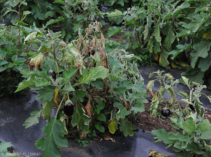 Flétrissement rapide des jeunes feuillesaux moments les plus chauds de la journée, souvent réversible durant la nuit dans un premier temps (figure 1) ; ils se manifestent soudainement et deviennent permanents. Les folioles et les feuilles finissent par se dessécher comme les plantes entières à terme (figure de 2).