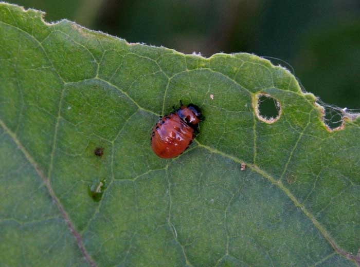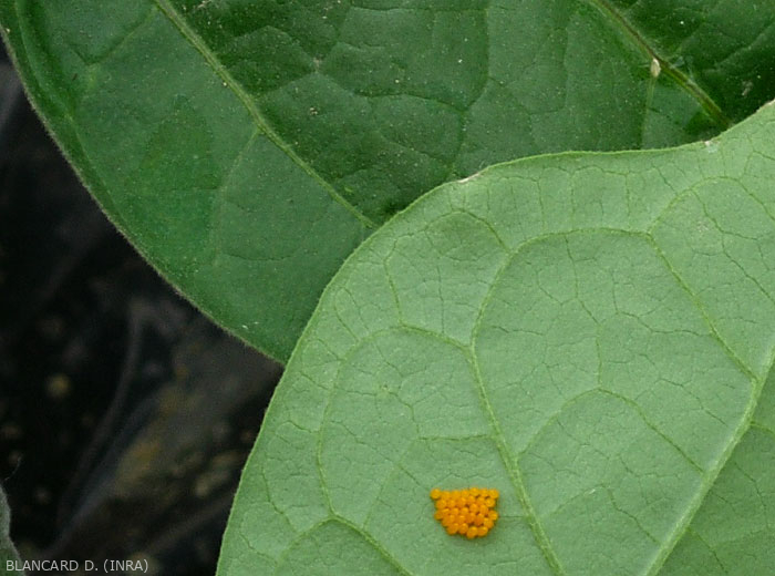L’adulte pond des oeufs de couleur jaune-orangé en amas sur la face inférieure des feuilles.