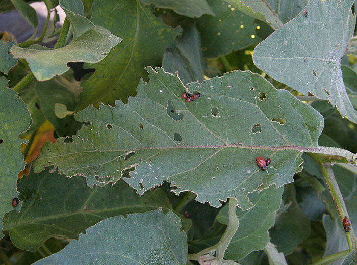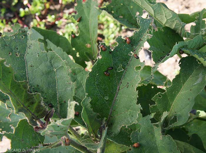 Les larves commencent à dévorer les feuilles qui les portent puis migrent jusqu’au sommet de la plante dévorant de fortes proportions du limbe.