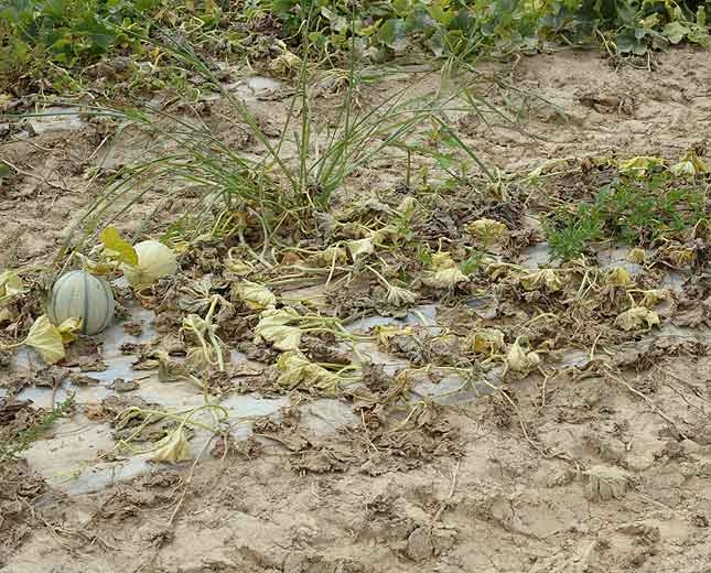 Monosporascus cannonballus provoque des symptômes assez comparables à ceux associés aux autres bioagresseurs telluriques des Cucurbitacées.