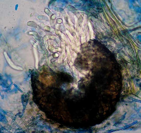 - les tissus sénescents présents dans l'environnement des plantes, sur lesquels les pycnides et les périthèces présents produiront respectivement des conidies et des ascospores contaminatrices.