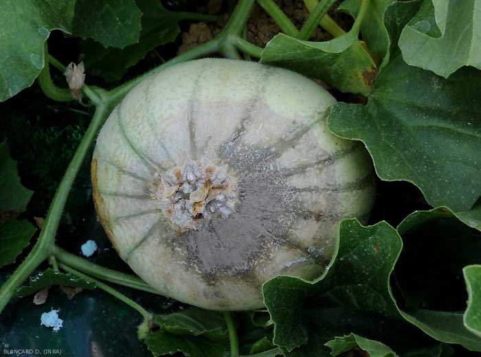 Les fruits des Cucurbitacées, comme ceux de nombreux autres espèces végétales, possèdent des portes d'entrée naturelles susceptibles d'être colonisées par Botrytis cinerea, et notamment des bases nutritives (tissus sénescents comme des fleurs, ou des pétales desséchés) ou des blessures. C'est notamment le cas au niveau de la cicatrice stylaire où les pétales fanés restent attachés (figures 2 et 3) durant un laps de temps plus ou moins long en fonction de l'hygrométrie ambiante. Ces derniers sont des bases nutritives idéales qui permettent à ce champignon opportuniste de s'installer et de contaminer dans un second temps les fruits (figure 4). C'est aussi dans cette zone stylaire qu'ont lieu les éclatements physiologiques (ou fentes de croissance) , blessures béantes favorables aux contaminations de B. cinerea. Ainsi, une pourriture humide, sombre se développe à l'extrémité des fruits (figure 5).