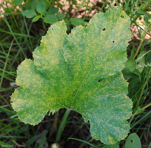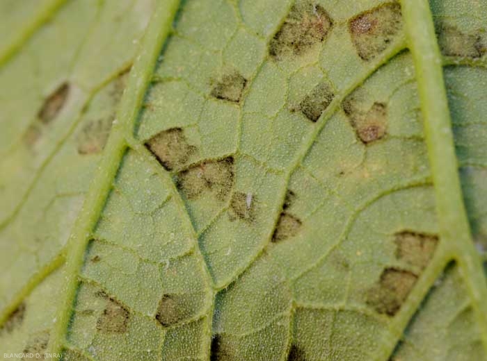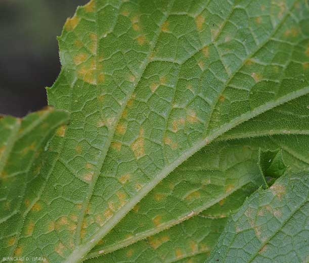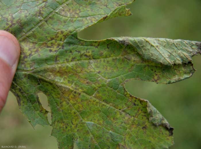 -sur certaines cucurbitacées, comme le concombre et la courgette, les taches sont surtout angulaires car elles sont délimitées par les nervures, ce qui confère au limbe un aspect mosaïque (figure 6). Ainsi, les feuilles présentent à terme une mosaïque en taches jaunes et/ou brunes si les lésions sont nécrosées. Ces pseudo-mosaïques ne doivent pas être assimilée à celles provoquées par les virus ;