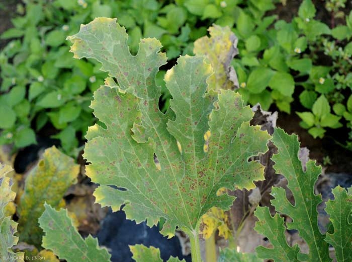 Sur pastèque, les taches foliaires peuvent être angulaires ou non, et de couleur brune à noire. Sur les feuilles des courges et du potiron, elles auraient une teinte plutôt orangée que jaune.