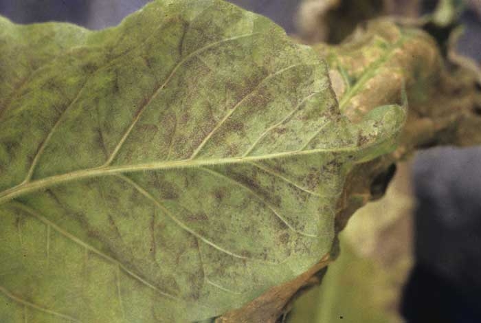 Peronospora hyoscyami f.sp. tabacina se développe sur tabac tout au long de son cycle de culture .