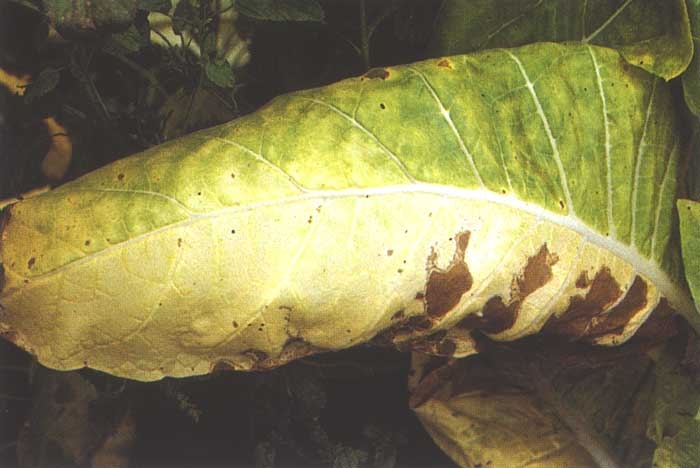 Les plantes affectées par Fusarium oxysporum f. sp. nicotianae présentent une à plusieurs feuilles qui jaunissent et se dessèchent progressivement unilatéralement (figures 1 et 2).