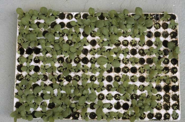 De temps à autre, on constate une réduction de la croissance des plantules liée à une irrigation excessive et/ou à l'emploi dans les bacs de semis flottants d'une eau trop chargée en bicarbonate de calcium (figure 1) ou insuffisamment enrichie en élément minéraux (N, P, K...) (figure 2). D'autre part, une augmentation de la concentration en sels solubles peut avoir lieu à la surface du sol surtout dans les pépinières insuffisamment irriguées. Dans ces conditions, les plantules jaunissent, brunissent en bordure du limbe et se dessèchent. Plusieurs arrosages consécutifs résolvent fréquemment ce problème.