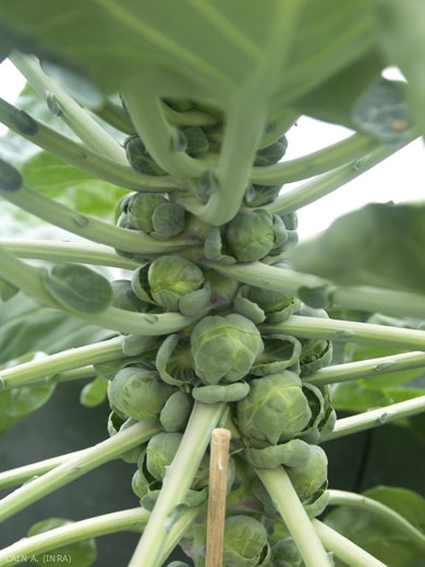 Le chou de Bruxelles (var. gemmifera, figure 4) est une plante vivace à longue tige (0,8 à 1 m) terminée par une rosette de feuilles et portant des feuilles à l'aisselle desquelles se développent des bourgeons axillaires ou pommes, que l'on appelle choux de Bruxelles, et que l'on consomme cuits comme un légume. Le nord de la France et les pays du Benelux sont les principaux producteurs. Il existe plusieurs variétés ; les hybrides, plus productifs et plus homogènes remplacent les variétés traditionnelles. Typiquement, le semis s'effectue en pépinières au printemps, puis les plants sont repiqués en plein champ. La plante est écimée, c'est-à-dire que le bourgeon terminal est supprimé, ce qui stoppe la croissance de la tige et permet une plus grande homogénéité dans la maturité des bourgeons. On récolte les pommes de 2 à 3 cm, vers octobre-décembre.