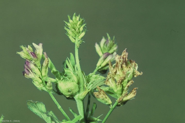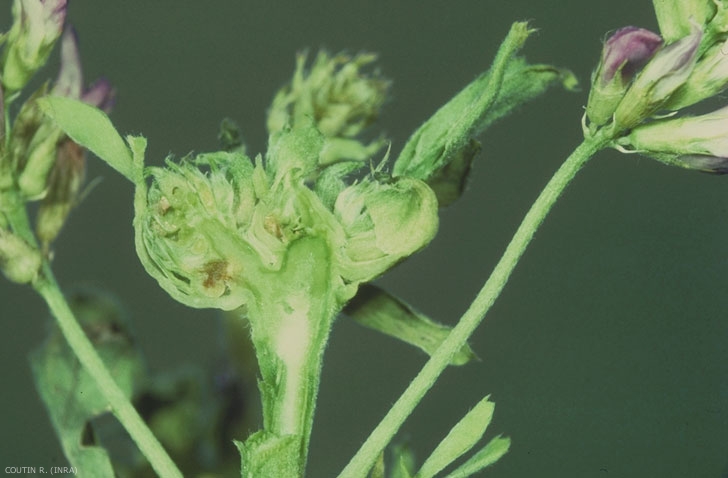 L'importance des dégâts est très variable selon le lieu et l'année. Les attaques sont plus importantes sur les pousses de printemps. Les bourgeons sont rapidement déformés sous l'action des larves et on observe la formation de galles en forme d'oignon (10 à 15 par tige) (figures 1 et 2). La croissance des bourgeons est entravée, ce qui stoppe la pousse et la floraison de la luzerne.