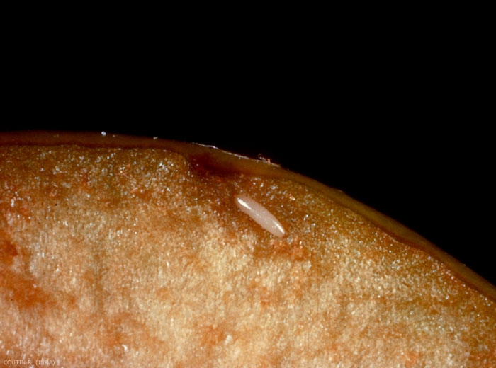 La longévité de adulte dépasse 6 mois. L'oviposition dure 25 à 30 jours, avec une possibilité d'interruption pendant 5 à 6 mois. La fécondité est de plusieurs centaines d'oeufs. L'oeuf est pondu sous l'épiderme du fruit. Il éclôt au bout de 2 à 4 jours au printemps et de 10 à 16 jours en hiver. La larve se développe en 9 à 14 jours, selon la température. Elle vit en endophyte et consomme la chair de l'olive (figure 5). La nymphose dure entre 10 et 14 jours à 25°C mais 3 mois si la température est proche du seuil inférieur. Elle a lieu dans le sol.