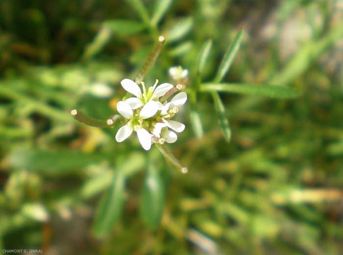 Fleurs blanches, petites, disposées en grappes, longuement dépassées par les siliques inférieures