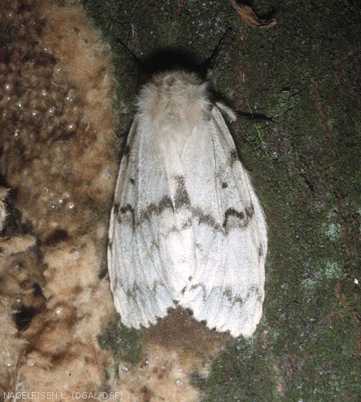 Le développement nymphal dure environ 15 jours, entre fin juin et mi-août puis les papillons apparaissent. Ils volent de mi-juillet à mi-août mais ne vivent que quelques jours. Les femelles, de couleur blanc crème, peu mobiles, restent "accrochées" sur le tronc des arbres, à proximité de leur lieu d'émergence, alors que les mâles volent dans les peuplements à la recherche des femelles. L'accouplement débute quelques heures à peine après l'émergence des papillons et la ponte a lieu quelques heures plus tard.