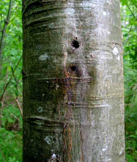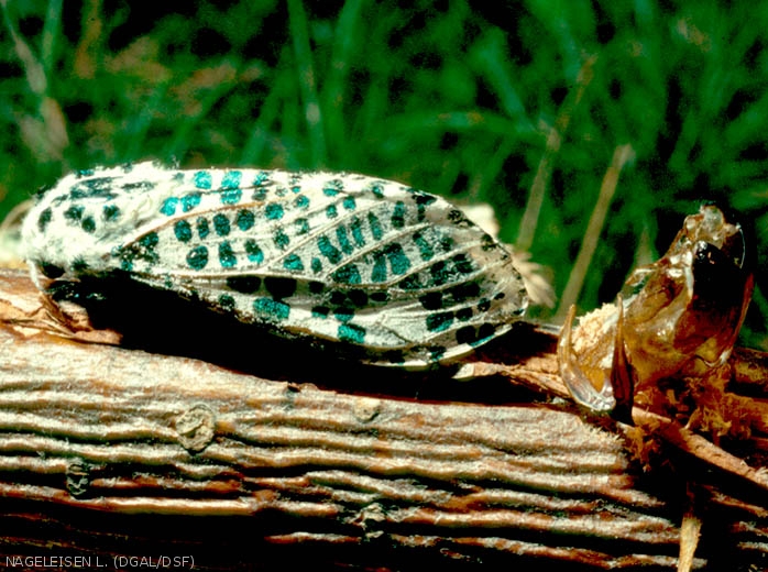 - Les dépouilles nymphales restent souvent accrochées au niveau des orifices de sortie des adultes (fin du printemps, début été).
