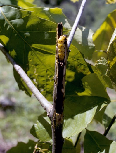 - En pépinière et jeune plantation, les dégâts sont beaucoup plus graves, la présence d'une seule chenille peut détruire l'axe principal et entraîner la mort de l'arbre