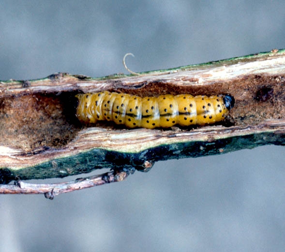 - L'observation de la chenille jaune clair tachetée de points noirs confirme le diagnostic mais il faut en général la chercher à l'intérieur du bois à l'aide d'un ciseau à bois.