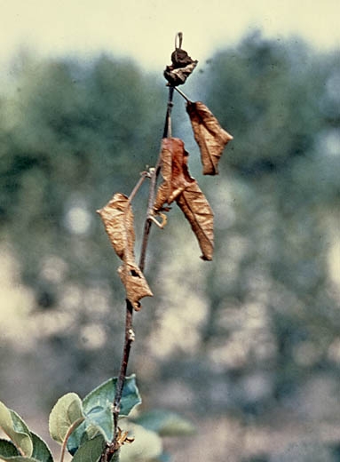 - En été, dépérissement de la partie terminale d'une branche ou de l'axe principale d'une jeune tige qui sèche et casse parfois au niveau de la zone atteinte qui est entièrement évidée. Déjections jaunâtres des chenilles sur les parties jeunes de l'arbre (bourgeons, pousses, nervures, pétioles).