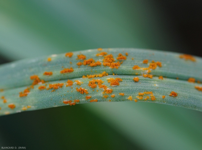 Les feuilles de poireau affectées présentent des petites lésions pustuleuses d'abord blanchâtres à beiges. Celles-ci s'étendent légèrement et donnent lieu à des pustules couleur orange vif à brun (figures 1 à 3), les feuilles se dessèchant à terme (figure 4).