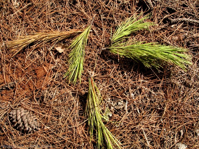 - Sur jeunes plantations : observation de pousses se signalant par une coloration anormale, un port anormal, une croissance ralentie des aiguilles ou la présence d'un trou de pénétration repérable (avec ou sans grumeaux de résine).