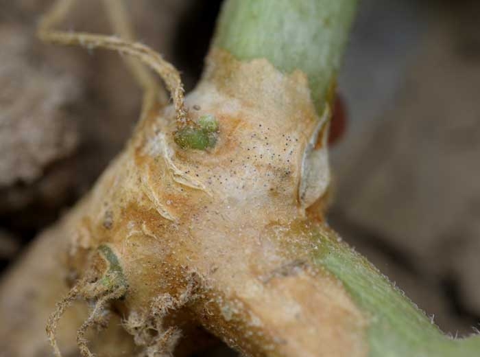 - une réduction de la taille du système racinaire, une pourriture brunâtre du cortex des racines et une dégradation de la partie basse de la tige dans les situations les plus extrêmes ;