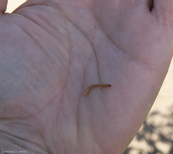 - Les larves (figures 1 et 2), nommées "vers fil de fer" car elles ressemblent à des vers, possèdent 3 paires de pattes. Elles sont de forme allongée, avec une tête brune aplatie, et peuvent mesurer de 2 à 25 mm de long suivant leur âge. Elles sont de couleur jaune paille et possèdent une carapace rigide et bien segmentée.