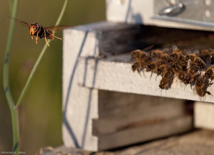 En Asie, dans son aire d’origine (figure 1), ce frelon est surtout connu comme étant un prédateur important de l’abeille domestique asiatique : Apis cerana. Cette espèce se défend efficacement et manifeste différents comportements de défense, dont le « heat-balling » qui consiste à former une grappe d’abeilles autour du frelon pour faire monter la température et le tuer (ces abeilles ayant un seuil de tolérance thermique plus élevé que le frelon).