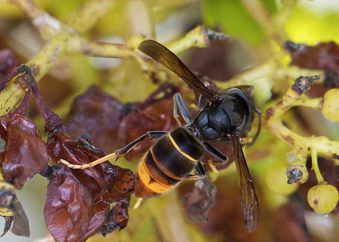 Enfin, notons que le frelon asiatique occasionne aussi des dégats sur les végétaux ; il les consomme parfois et notamment des fruits comme par exemples des baies de raison (figure 8), des pêches (figure 9)...