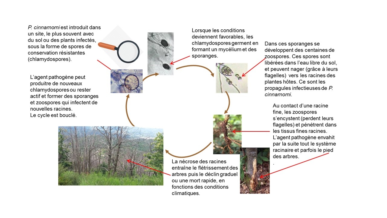 Phytophthora cinnamomi et P. cambivora sont des agents pathogènes connus depuis de nombreuses années comme responsable de la maladie de l'encre sur le chêne et le châtaignier. Etant très polyphage, ils sont capables d'infecter un grand nombre d'espèces d'espèces ornementales et d'arbres forestiers. P. cinnamomi est un parasite exotique : depuis son aire d'origine en Asie du sud-est, il s'est répandu à travers le monde occasionnant des dépérissements importants (notamment sur Eucalyptus en Australie et avocatier). En France, le châtaignier est l'une des essences les plus sensibles avec le chêne vert et le chêne liège. Les arbres sont tués quelque soit l'âge ou la dimension de l'arbre. Le chêne rouge et le chêne pédonculé sont aussi des espèces sensibles mais dont le système racinaire est moins impacté. Le chêne sessile est plus tolérant et peut être envisagé comme essence de remplacement.