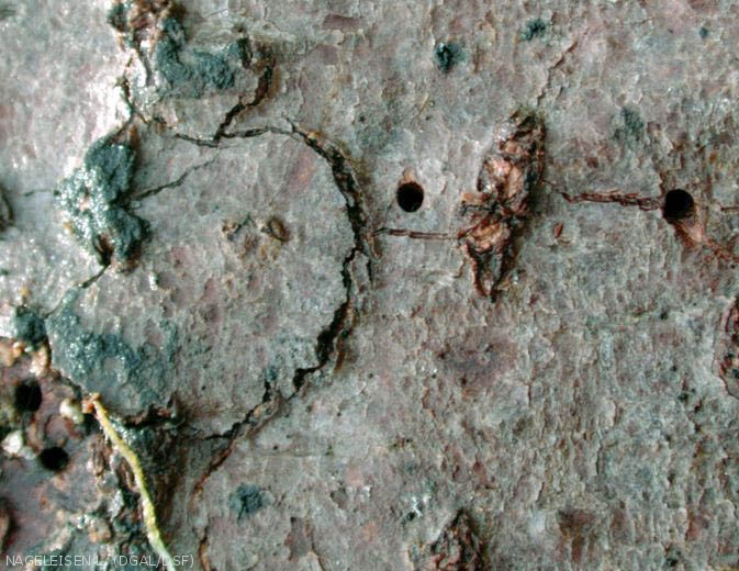 - Présence d'écoulements de résine à l'entrée des galeries d'hivernation (automne) ou des galeries de ponte (printemps, été)