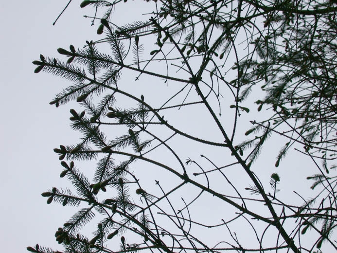. l'observation attentive permet de déceler des pucerons petits, verts et plus gros, bruns, violacés, sur la face inférieure des aiguilles ;