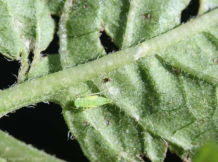 Les dégâts de cicadelles sont provoqués par les piqûres sur les folioles des pommes de terre qui entraînent la formation de nécroses et le dessèchement des nervures, puis un éclaircissement du limbe progressant depuis le bord de la foliole vers le centre de celle-ci, ou localement au niveau des piqûres (figure 2).