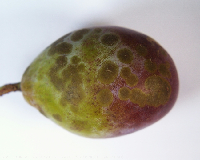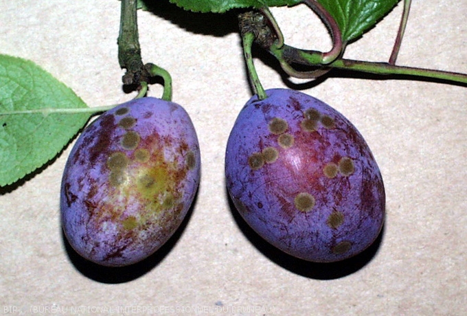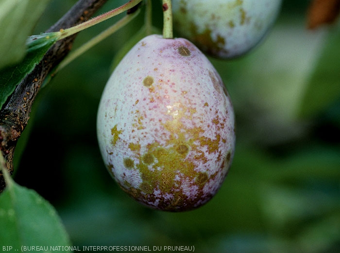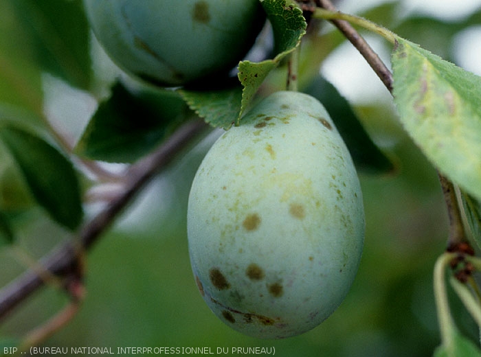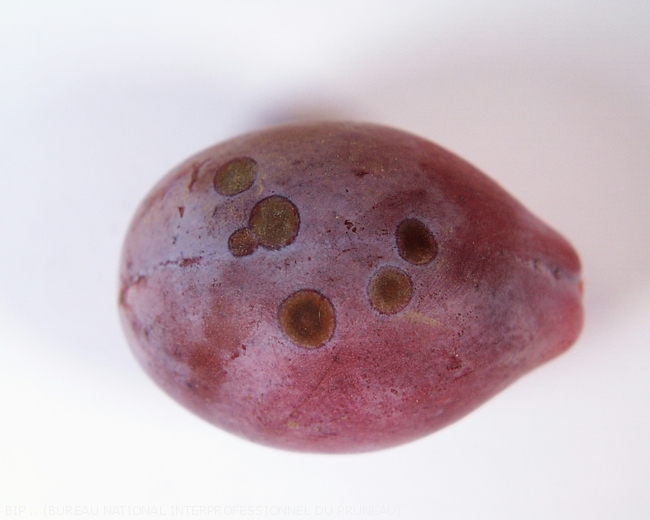 Sur pruneau, les taches causées par la tavelure constituent un défaut grave dès que leur diamètre cumulé excède 2 cm.