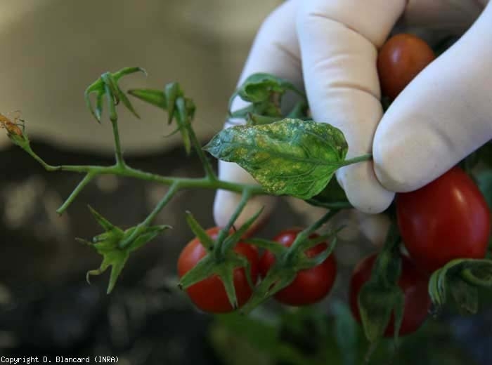 - Symptômes types : rabougrissement des plantes, épinasties, décolorations foliaires, éclaircissement ou nécrose des nervures, déformations foliaires, lésions nécrotiques foliaires locales ou généralisées, mort des plantes.
