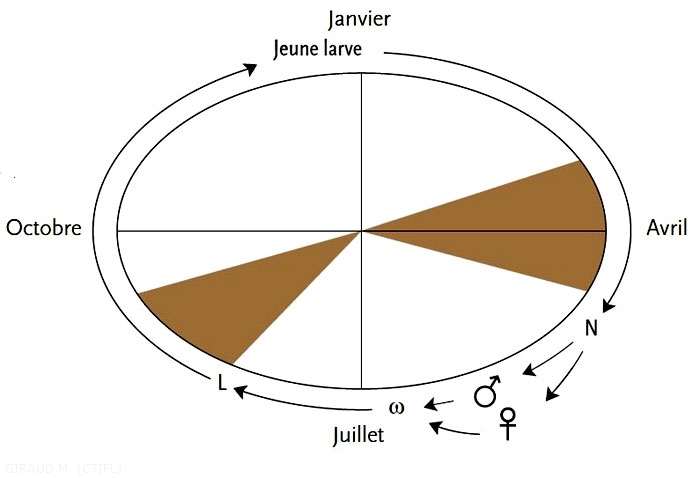 La nymphose a lieu dans des abris foliaires. Les adultes apparaissent en été. La ponte et l’éclosion des oeufs se succèdent jusqu’en fin de saison.